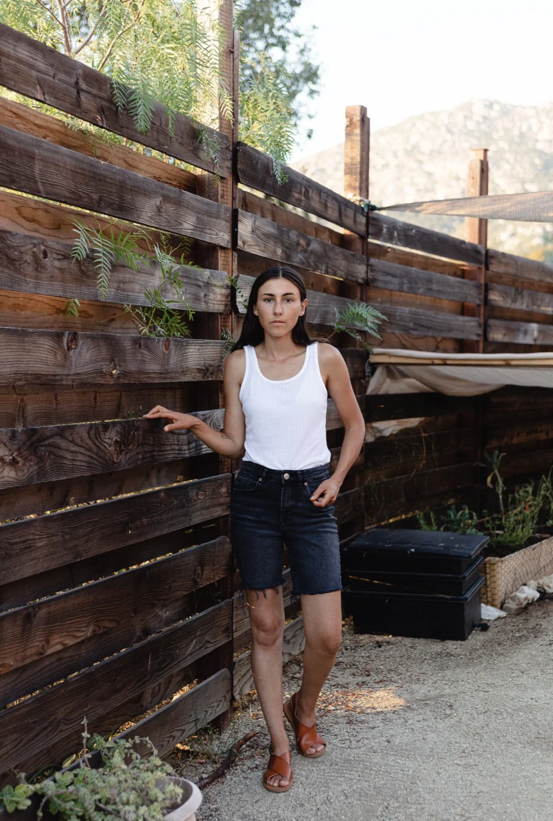 Woman in white tank top and dark shorts standing by wooden fence outdoors.