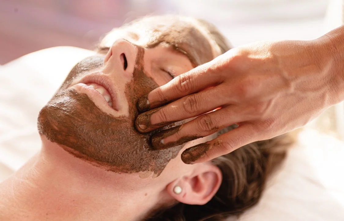 Person receiving facial treatment with brown paste on face, lying on white fabric, hands holding mug.